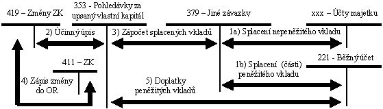 Schéma naznačuje účtování zvýšení ZK s. r. o. upsáním nových vkladů u nabyvatele.